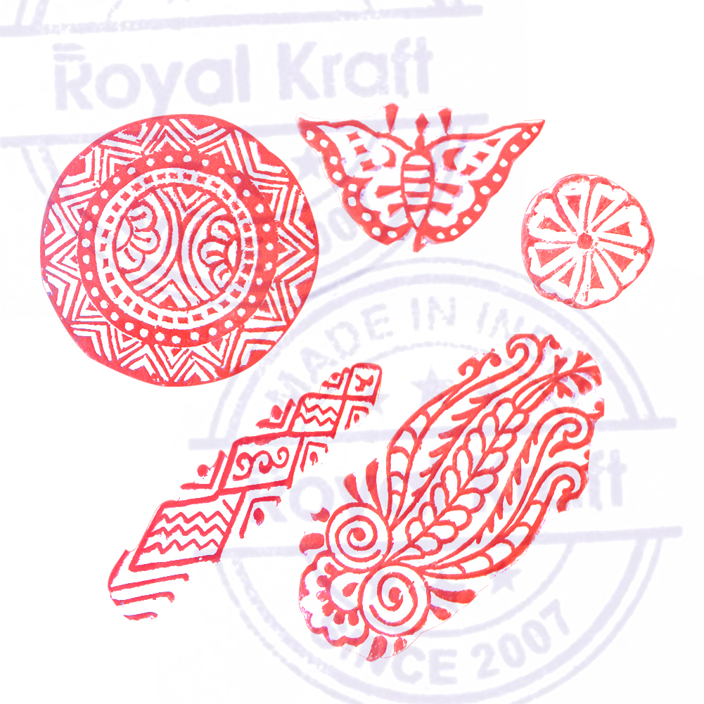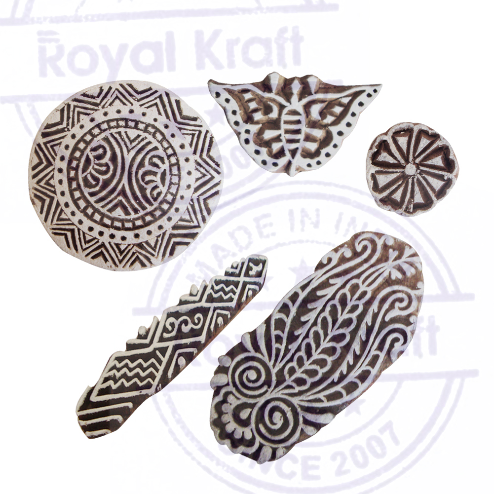 Buy Wooden Stamps for Block Printing on fabric, textile, clay, pottery, henna tattoo, paper from Royal Kraft. Wooden printing stamps are wonderful tools for adding intricate designs to various surfaces. When selecting wooden printing stamps, consider the intricacy of your design needs, the quality of the wood, and the size of the stamp. Hand-carved stamps might offer an authentic, artisanal touch, consistency in the print.
