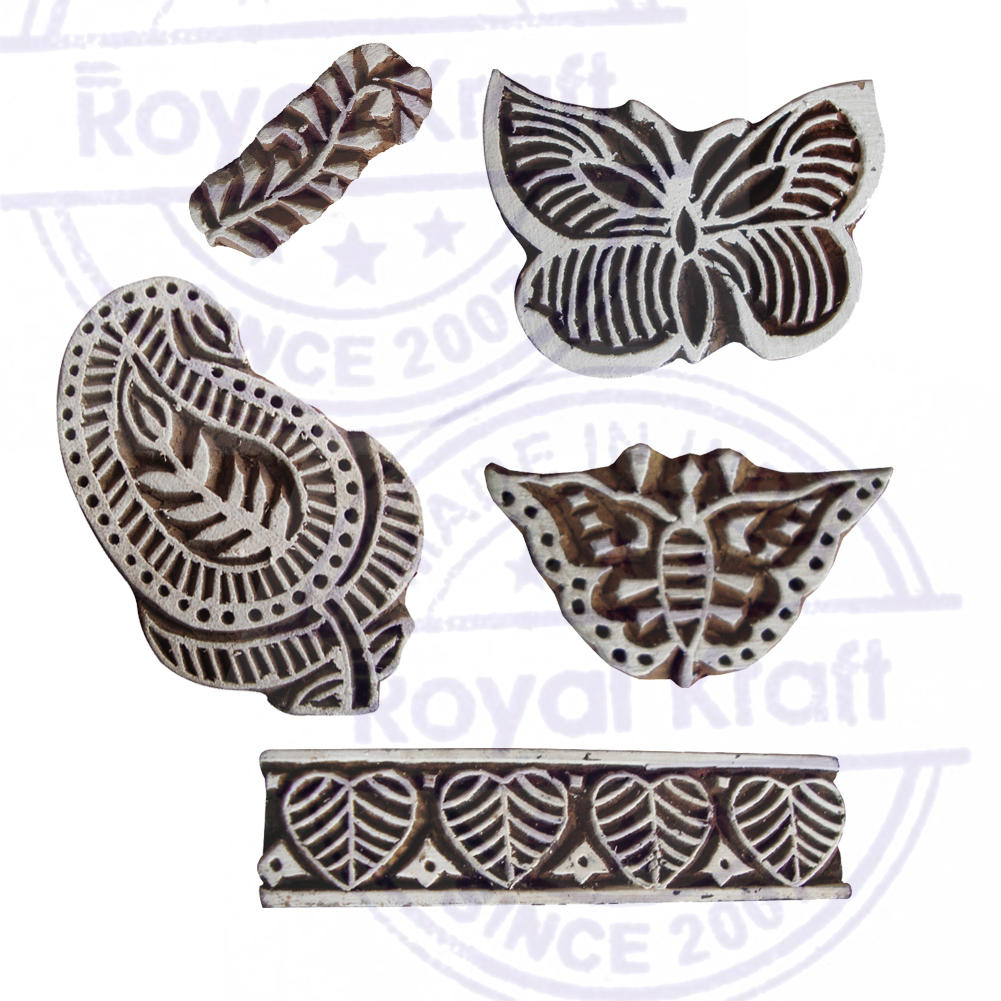 Jaipuri Butterfly and Floral Designs Wood Print Blocks (Set of 5)