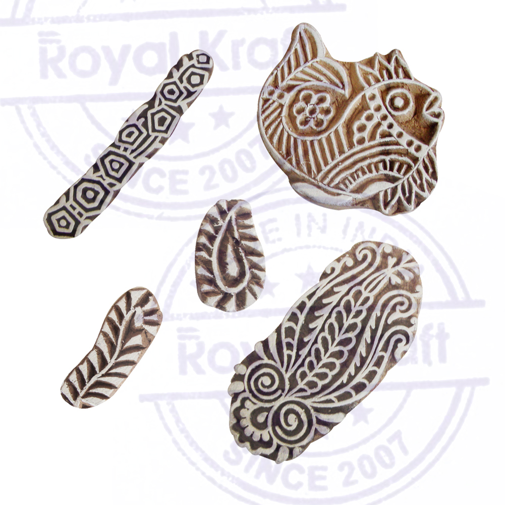 Buy Wooden Stamps for Block Printing on fabric, textile, clay, pottery, henna tattoo, paper from Royal Kraft. Wooden printing stamps are wonderful tools for adding intricate designs to various surfaces. When selecting wooden printing stamps, consider the intricacy of your design needs, the quality of the wood, and the size of the stamp. Hand-carved stamps might offer an authentic, artisanal touch, consistency in the print.