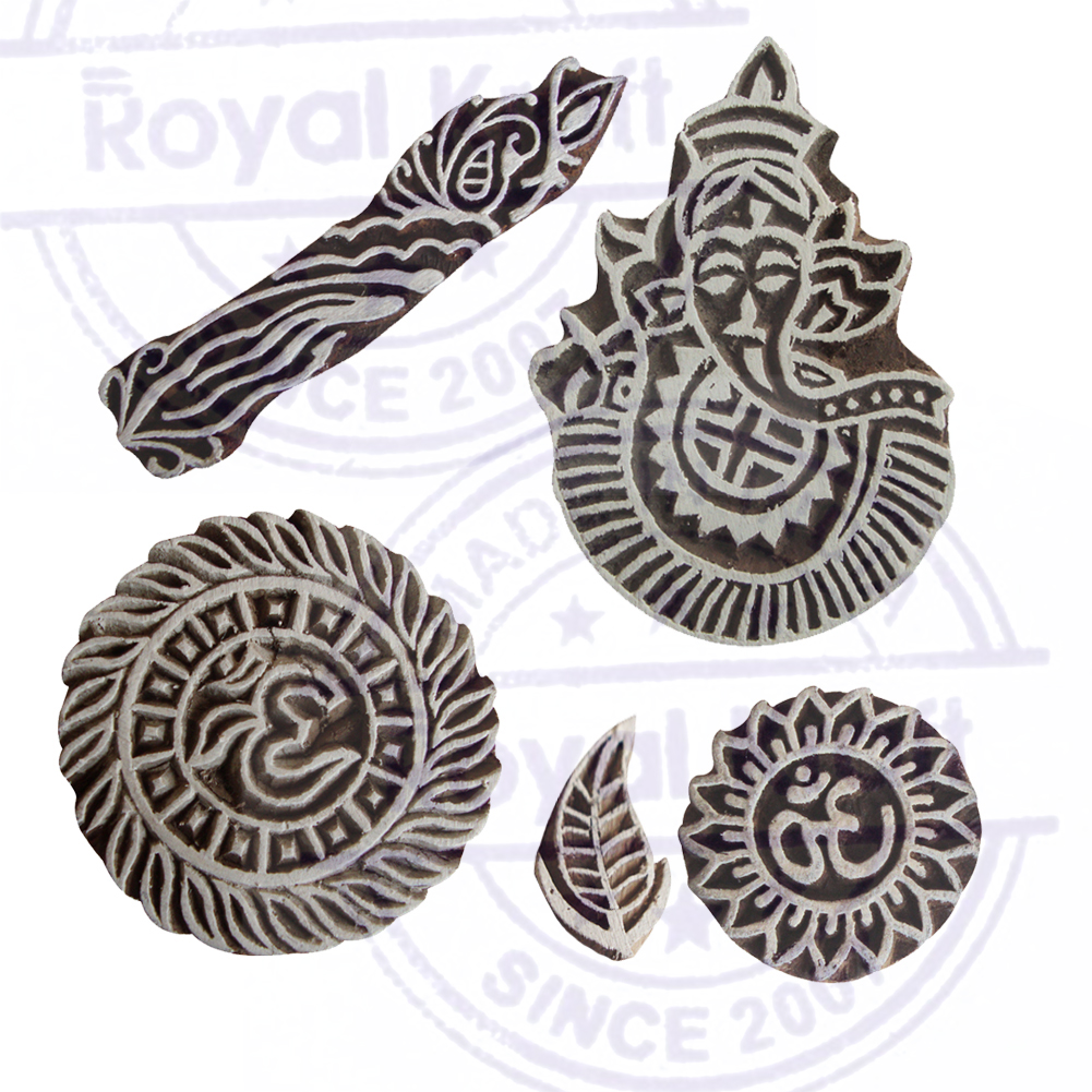 Intricate Motif Ganesh and Hamsa Hand Wooden Printing Stamps (Set of 5)
