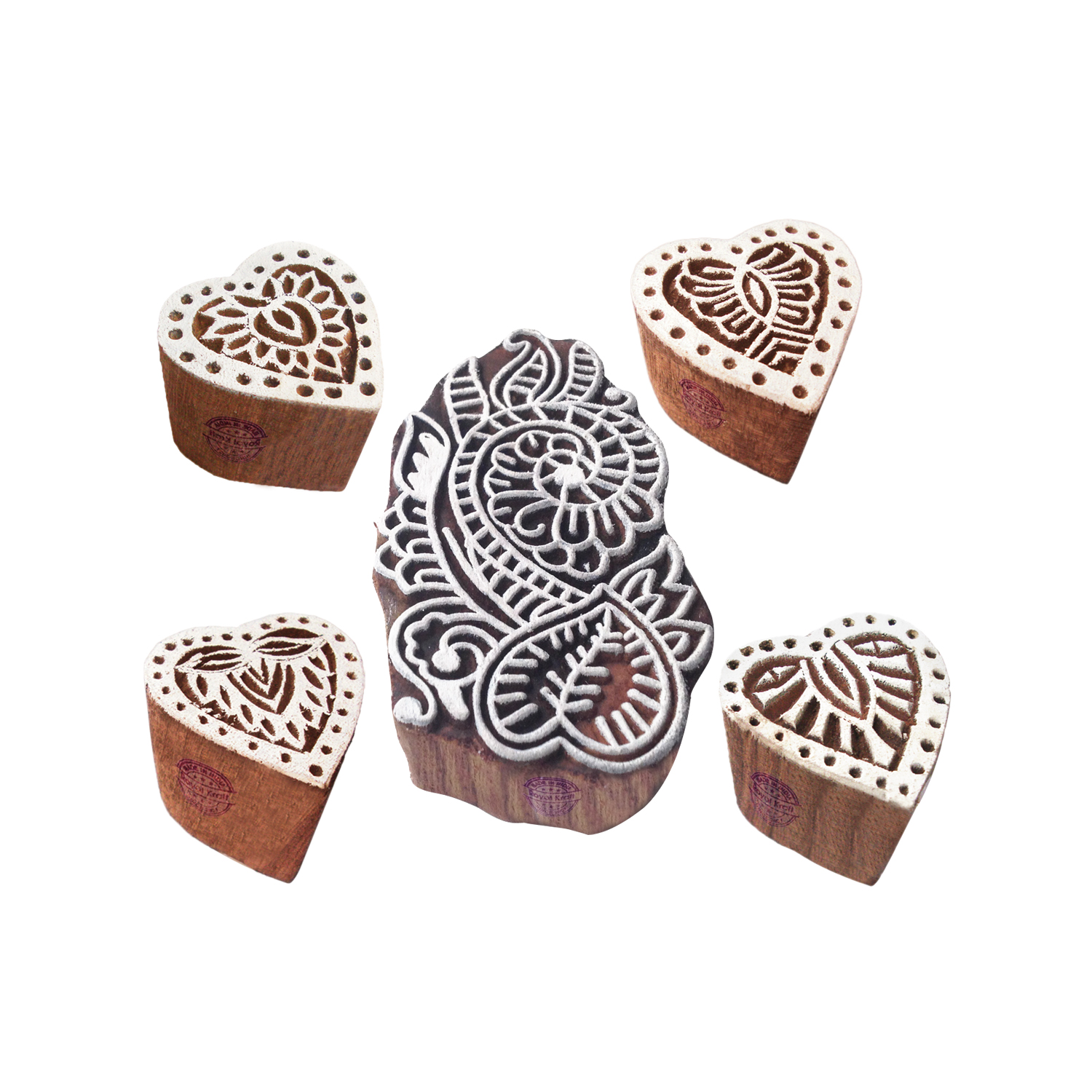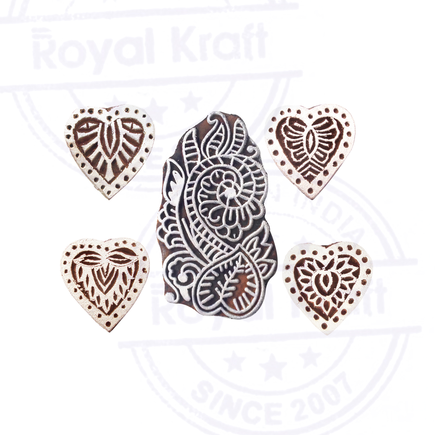 Ornate Motif Heart and Damask Block Print Wood Stamps (Set of 5)