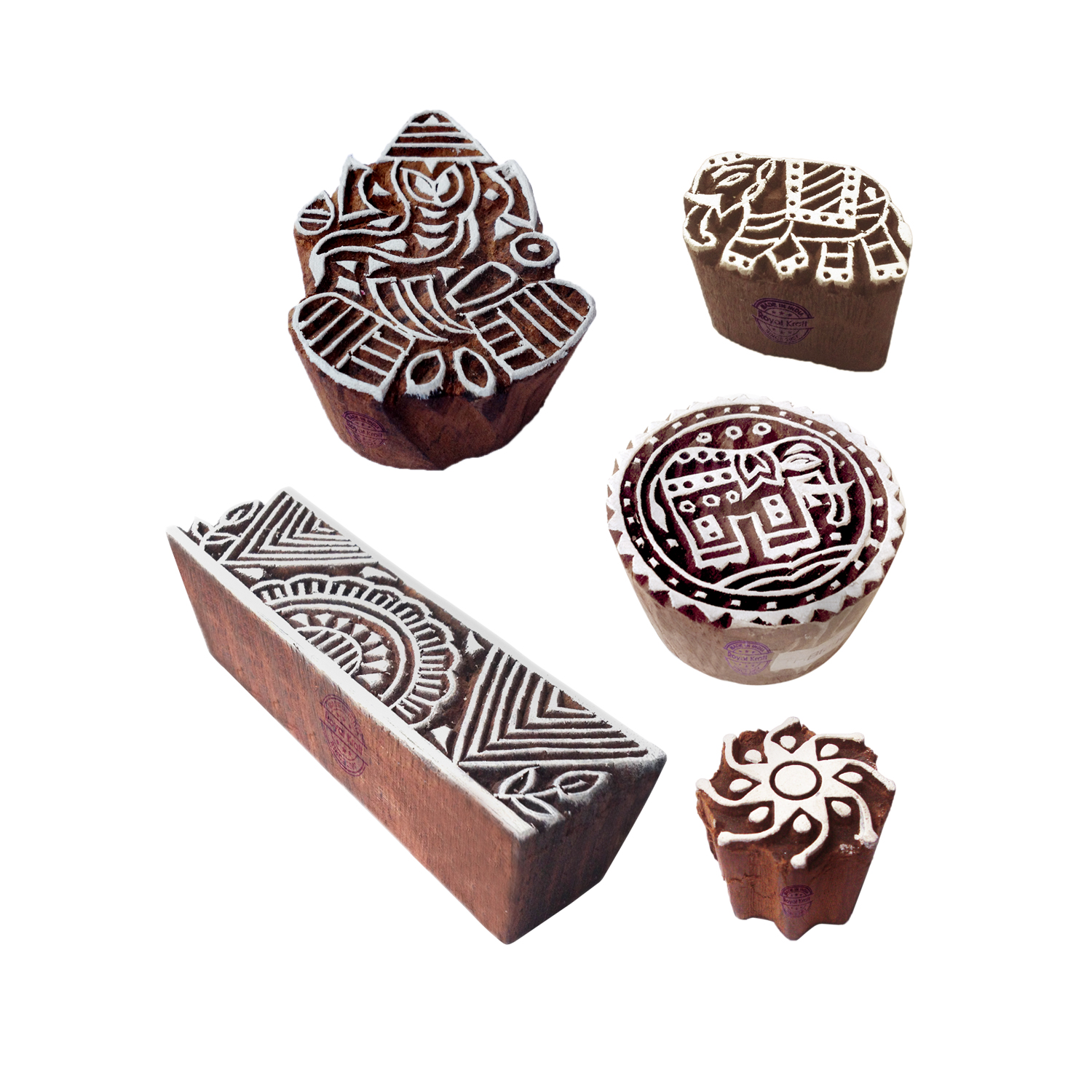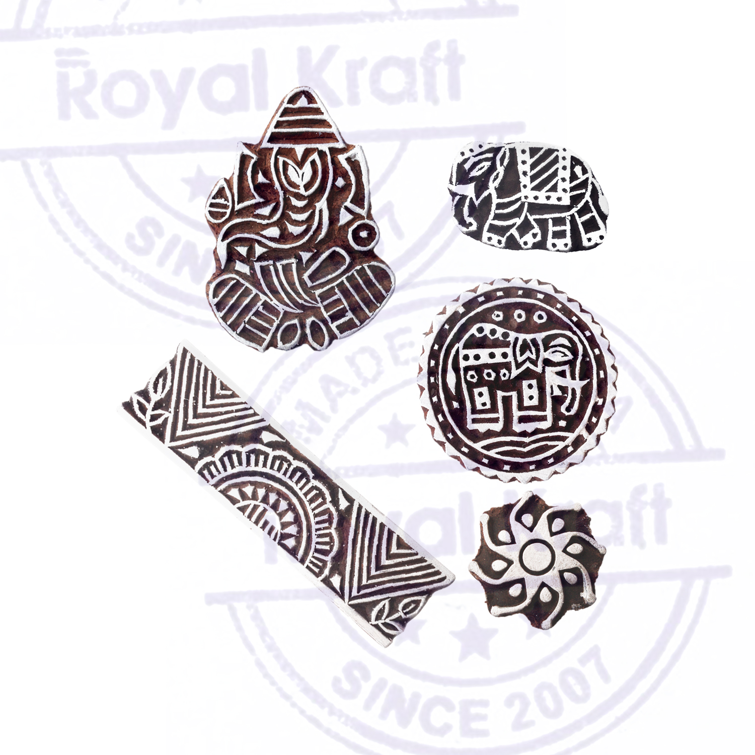 Ornate Motif Elephant and Ganesha Wood Stamps for Printing (Set of 5)